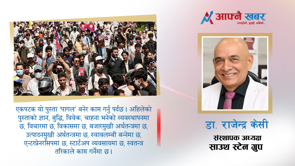 एकपटक यो पुस्ता ‘बौलाहा’ बनेर काम गर्नुपर्दछ । ‘पागल’ बनेर काम गर्नु पर्दछ । अहिलेको पुस्ताको ज्ञान, बुद्धि, विवेक, चाहना भनेको व्यवस्थापनमा छ, विचारमा छ, विकासमा छ, बजारमुखी अर्थतन्त्रमा छ, उत्पादनमुखी अर्थतन्त्रमा छ, स्वावलम्बी बन्नेमा छ, इन्टरप्रेनरसिपमा छ, स्टार्टअप व्यवसायमा छ, स्वतन्त्र तरिकाले काम गर्नेमा छ ।