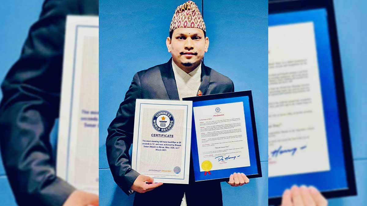 काठमाडौँ/ विभिन्न खेलको कला प्रदर्शनमा २१ पटक गिनिज वर्ल्ड रेकर्ड राख्न सफल दिनेश सुनारलाई अमेरिकामा खेल विज्ञानमा मानार्थ विद्यावारिधि प्रदान गरिएको छ । इन्टरनेशनल इन्टर्नशीप युनिभर्सिटीले हालै स्पोर्टस् साइन्स एण्ड ह्युमन पर्फमेन्समा मानार्थ विद्यावारिधि दिएको हो ।