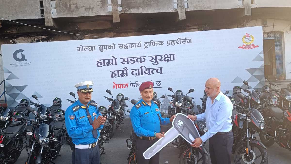 वर्तमान परिस्थितिमा स्रोत साधनको अभावले ट्राफिक व्यवस्थापन तथा सुरक्षित आवागमनमा परिरहेको असरलाई मध्यनजर गर्दै गोल्छा ग्रुपले आज काठमाडौँ उपत्यका ट्राफिक प्रहरी कार्यालयमा आयोजित एक कार्यक्रममा २० थान (पल्सर १५० सिसी) मोटरसाइकल प्रदान गरेको ट्राफिक प्रहरी प्रमुख एवं वरिष्ठ प्रहरी उपरीक्षक नवराज अधिकारीले जानकारी दिनुभयो ।